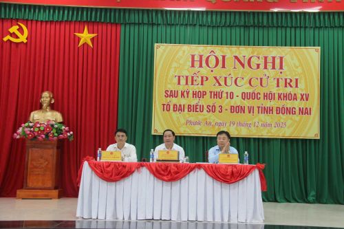 Sáng ngày 19/12/2025, Tổ Đại biểu Quốc hội (ĐBQH) đơn vị số 3 tỉnh Đồng Nai gồm các đại biểu: Ông Bùi Xuân Thống, Tỉnh ủy viên, Phó Trưởng đoàn chuyên trách Đoàn Đại biểu Quốc hội tỉnh; Ông Nguyễn Công Long, đại biểu hoạt động chuyên trách tại Ủy ban Pháp luật và Tư pháp của Quốc hội và ông Đỗ Huy Khánh, Bí thư Đảng ủy, Chủ tịch HĐND xã Phước An đã có buổi tiếp xúc với hơn 140 cử tri của 03 xã: Phước An, Nhơn Trạch và Đại Phước sau Kỳ họp thứ 10, Quốc hội khóa XV.