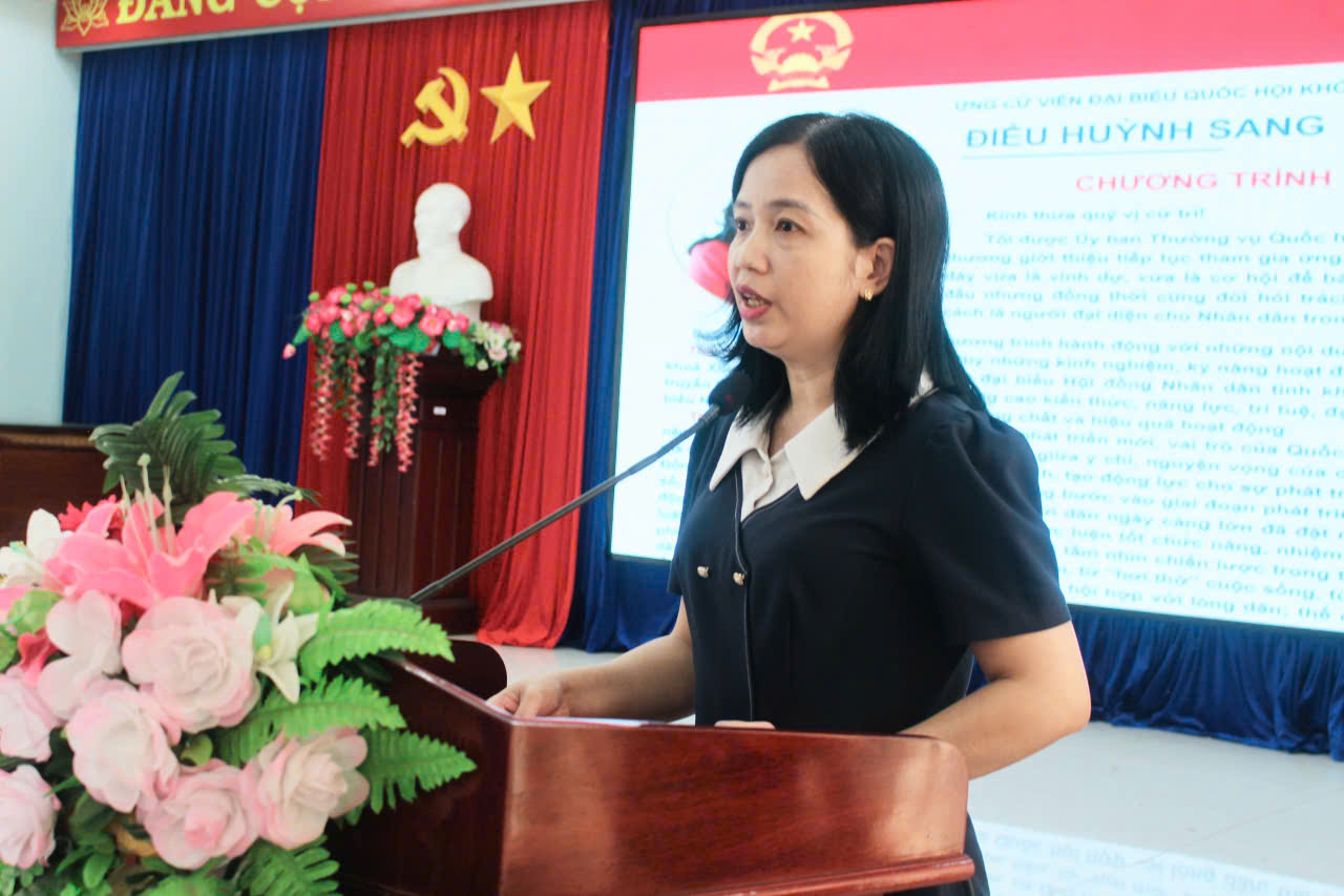 Ứng cử viên đại biểu Quốc hội khóa XVI Điểu Huỳnh Sang, Tỉnh ủy viên, Phó Trưởng đoàn chuyên trách Đoàn đại biểu Quốc hội tỉnh trình bày chương trình hành động tại hội nghị